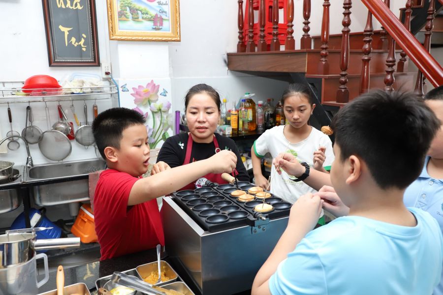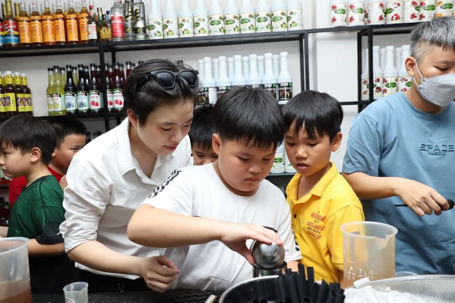 Các em rất hào hứng khi được hướng dẫn và trực tiếp tham gia hoạt động pha chế các loại nước uống, làm bánh và thưởng thức các sản phẩm do chính tay mình làm ra.