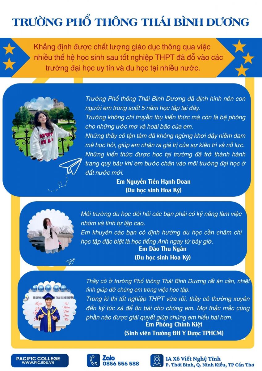 Trường phổ thông Thái Bình Dương không chỉ là nơi cung cấp kiến thức mà còn là môi trường nuôi dưỡng tài năng, khát vọng và ước mơ của từng học sinh. Nhà trường cam kết đồng hành hỗ trợ học sinh trên con đường chinh phục tri thức và khẳng định bản thân.
