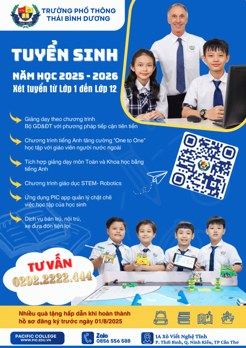 Năm học 2025 - 2026, trường Phổ thông Thái Bình Dương tổ chức tuyển sinh từ lớp 1 đến lớp 12 theo hình thức xét tuyển học bạ.