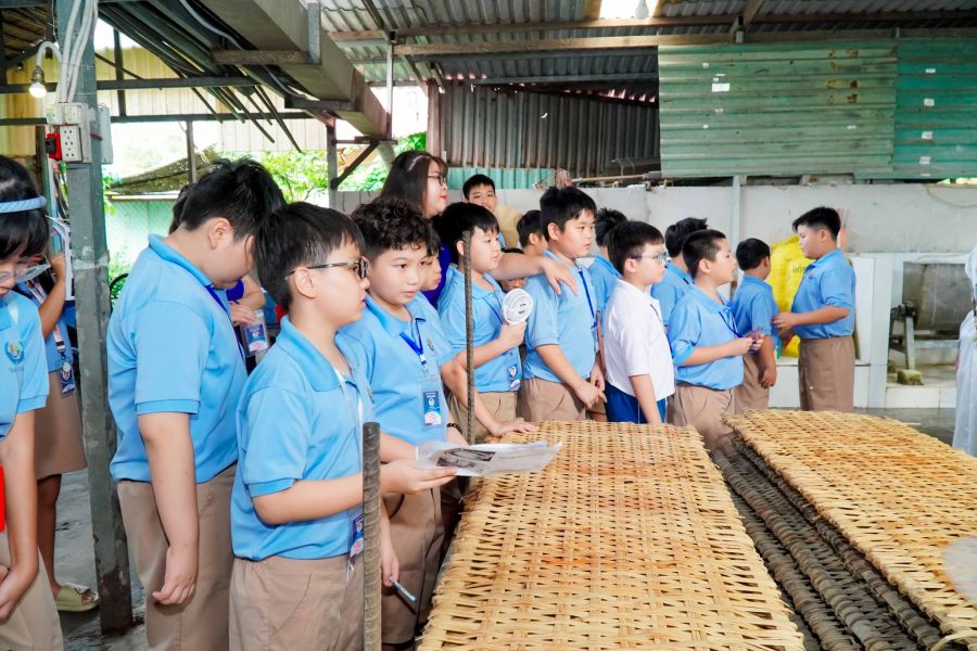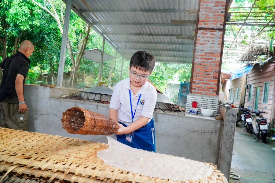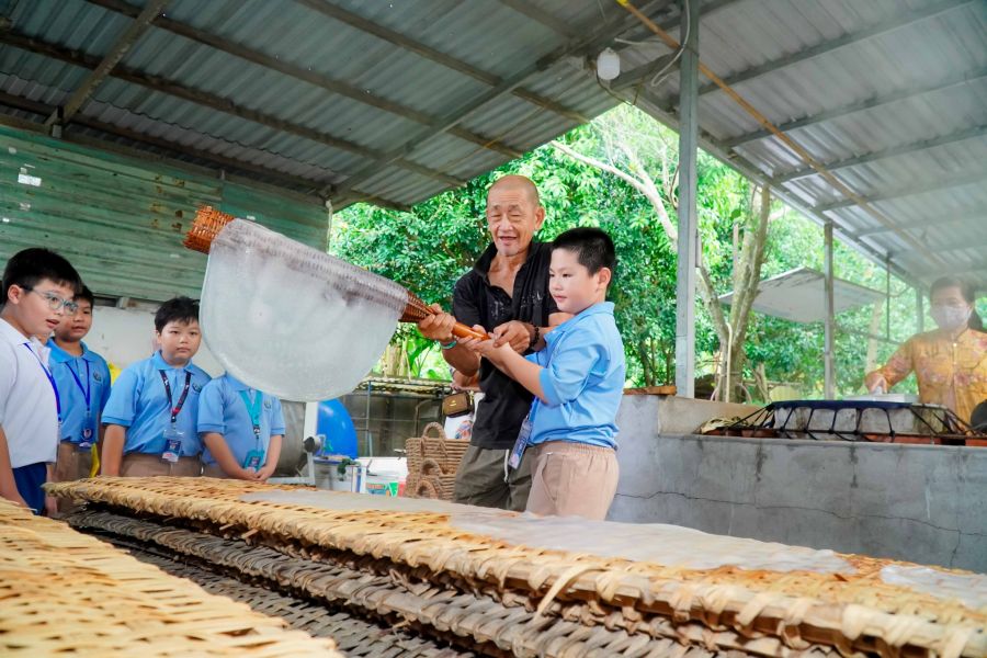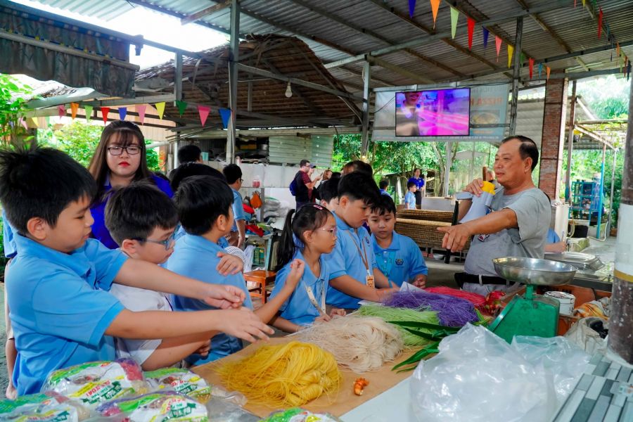 Tại đây, các em được quan sát quy trình làm hủ tiếu từ khâu chọn gạo, xay bột, tráng bánh, phơi khô đến đóng gói sản phẩm. Đặc biệt, các em học sinh còn được trực tiếp trải nghiệm tráng bánh và cắt hủ tiếu, tạo nên những giây phút trải nghiệm đầy thú vị và đáng nhớ.