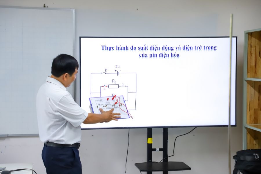 Thay vì chỉ ghi nhớ các định luật khô khan trên trang giấy, các "nhà khoa học trẻ" Trường Phổ thông Thái Bình Dương đã được trực tiếp bắt tay vào thực hiện bài thực hành: Đo suất điện động và điện trở trong của pin điện hóa.